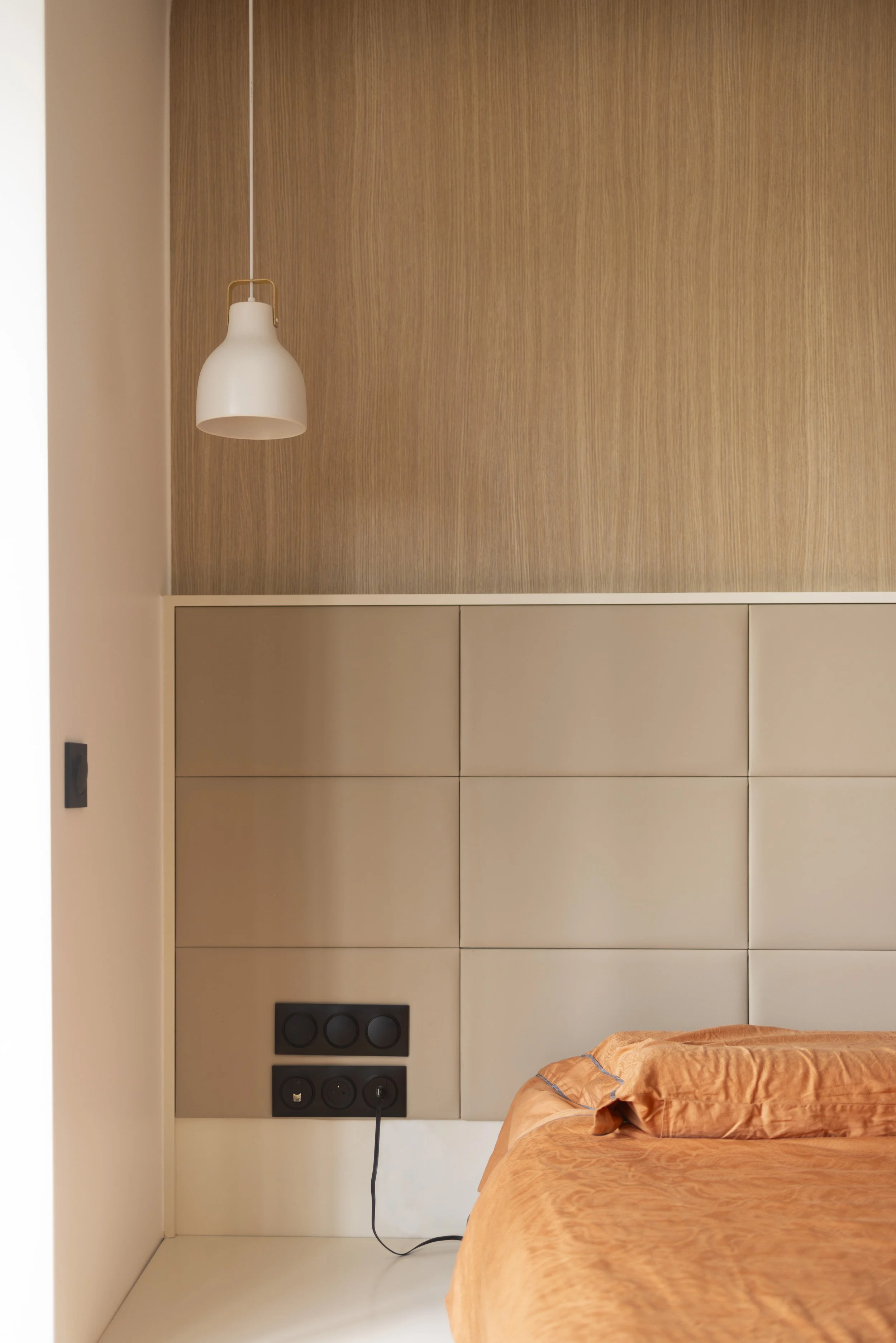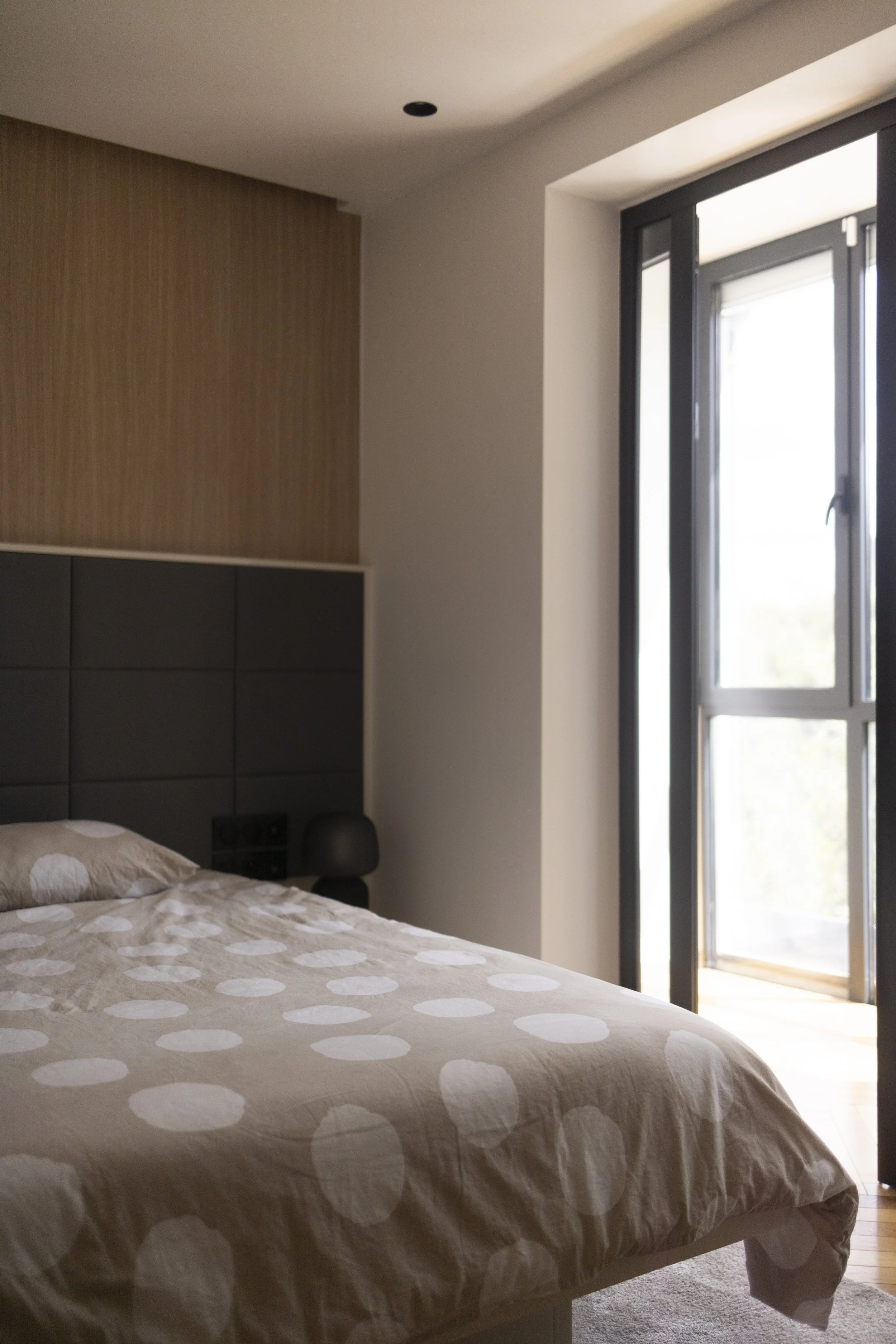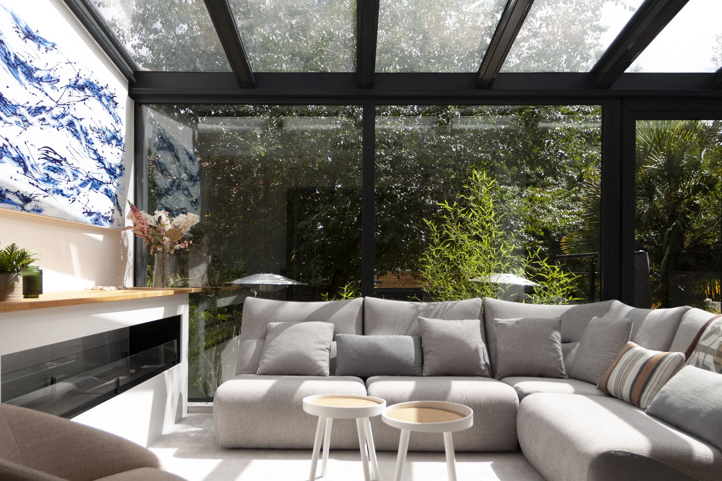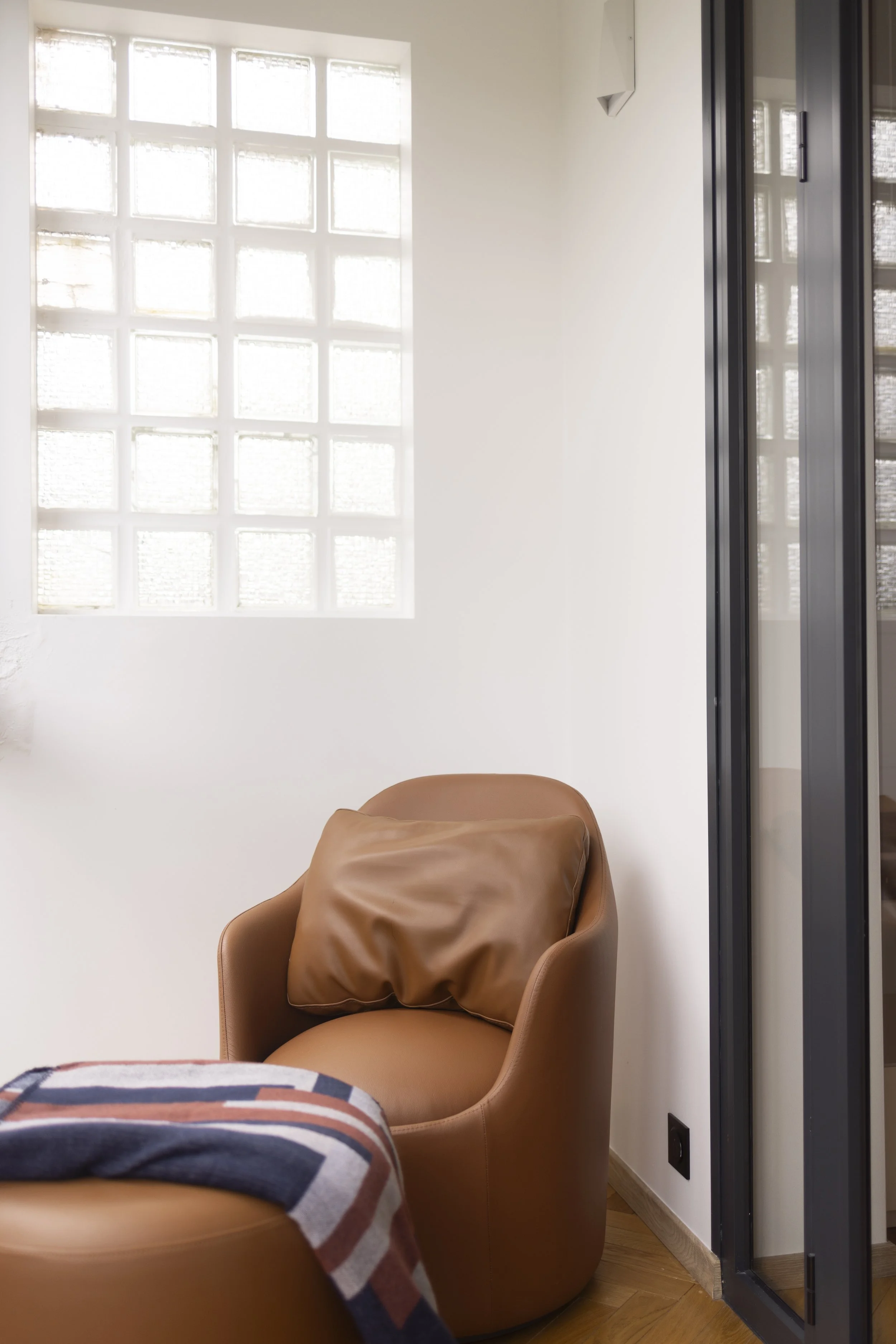 L’atmosphère cosy est accentuée par l’utilisation des tons clairs et des matières naturelles ainsi que par la luminosité générale de la maison. Celle-ci est amenée grâce à la création d’ouvertures et de larges cloisons vitrées.