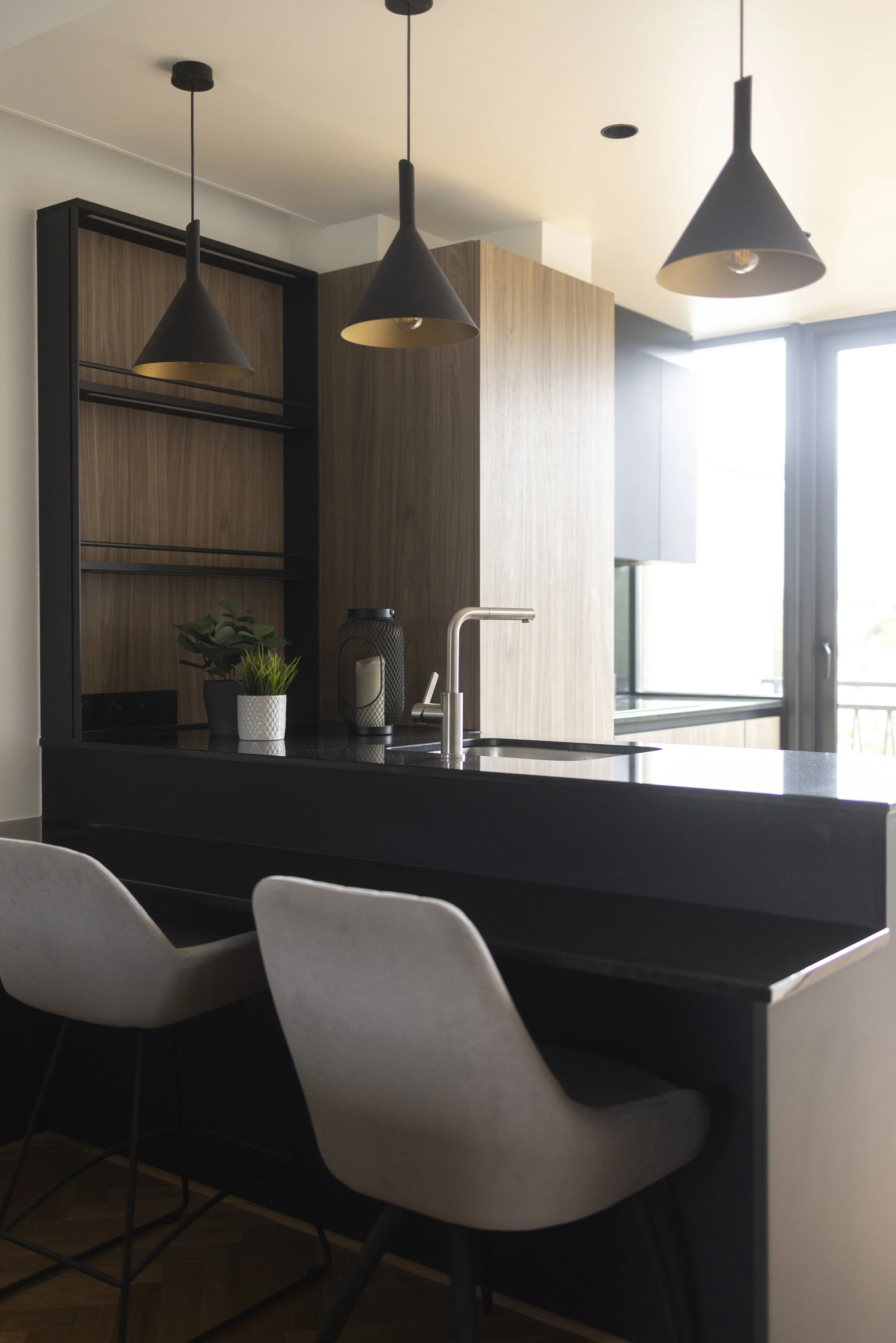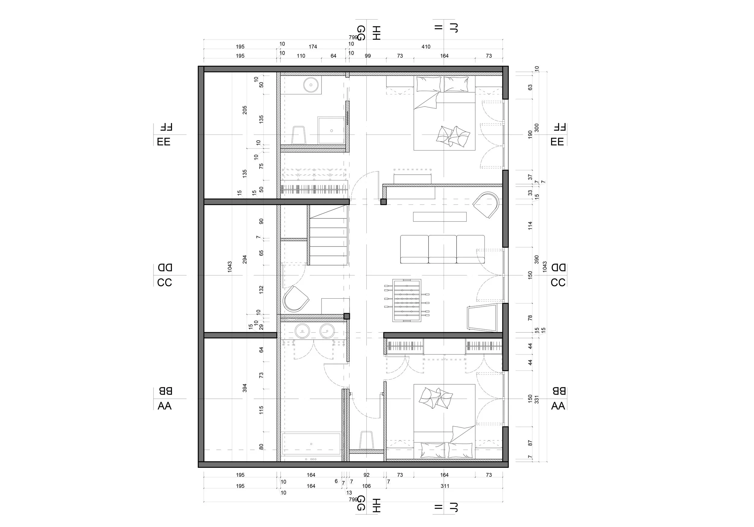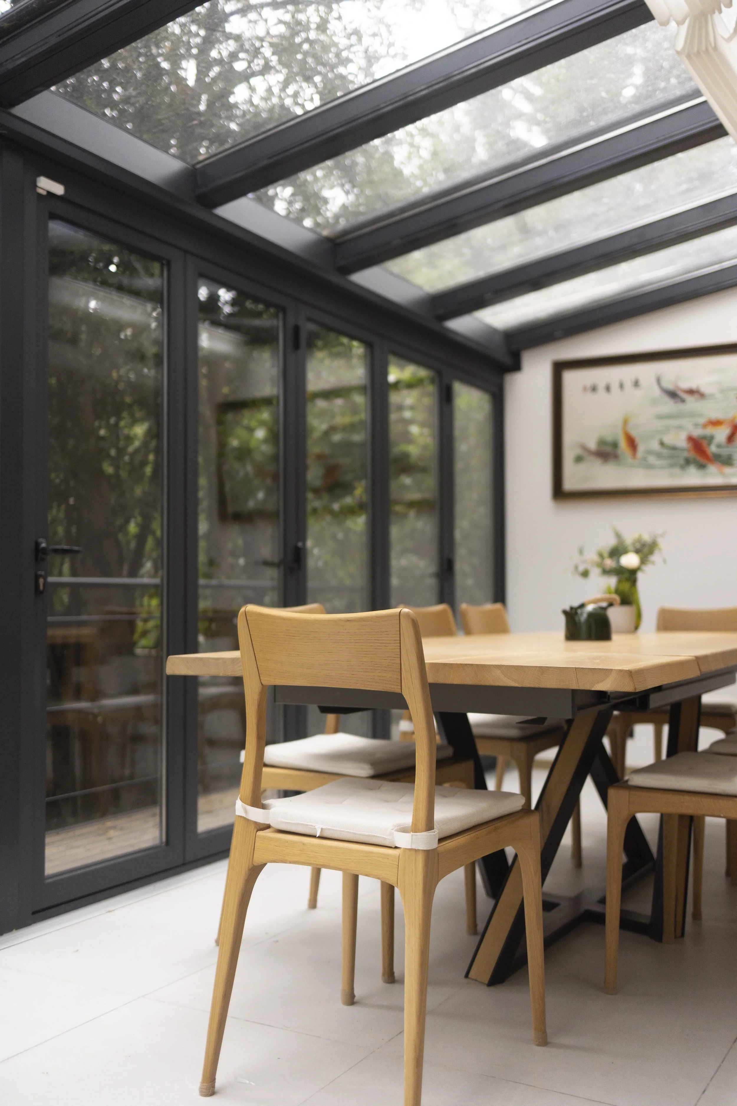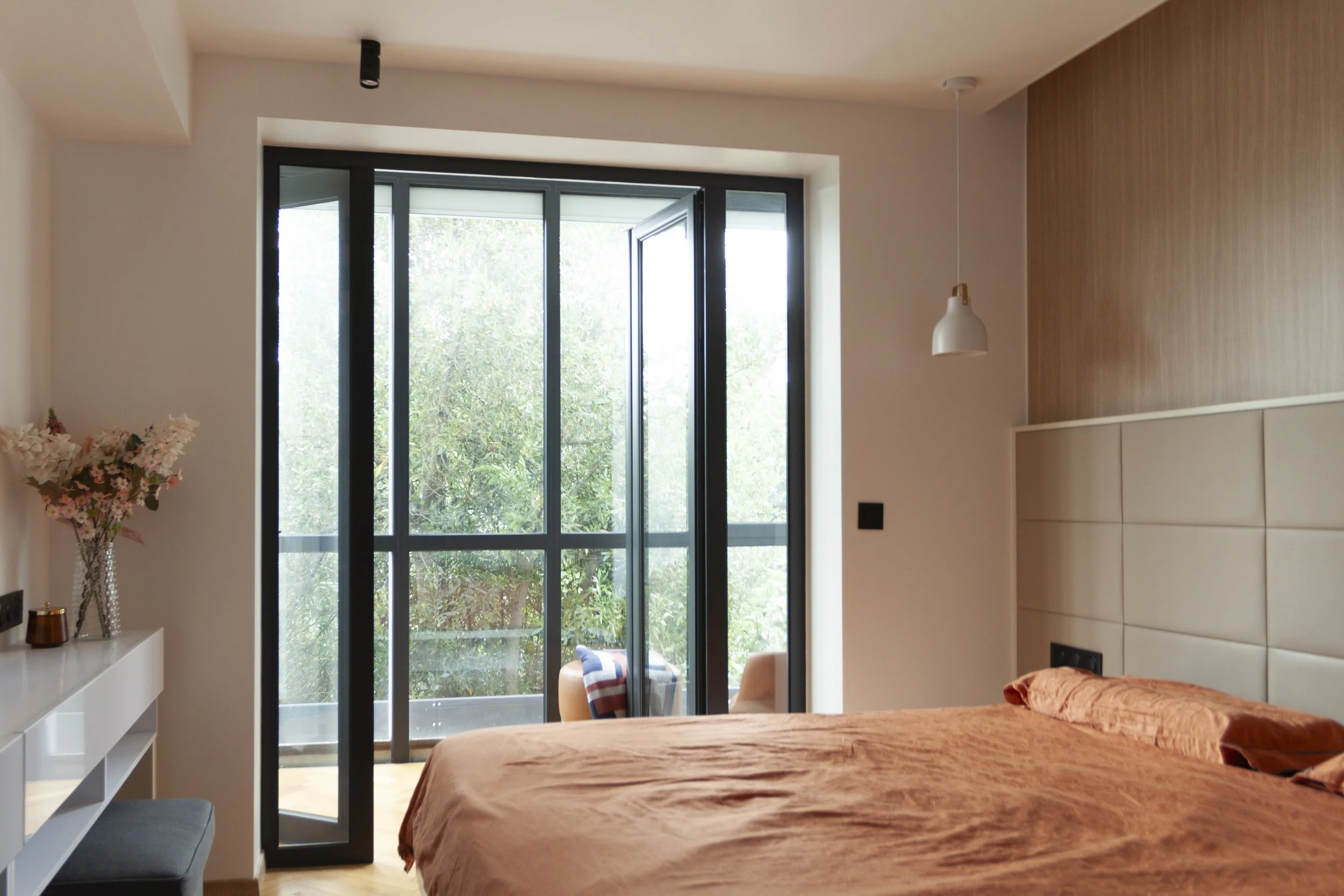 L’atmosphère cosy est accentuée par l’utilisation des tons clairs et des matières naturelles ainsi que par la luminosité générale de la maison. Celle-ci est amenée grâce à la création d’ouvertures et de larges cloisons vitrées.